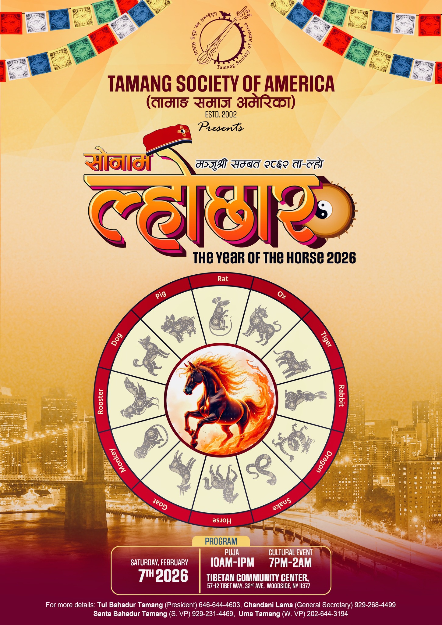 The Tamang Society of America is pleased to inform you that on the auspicious occasion of the upcoming Sonam Lhochhar, Manjushree Year 2862 (Year of the Tiger), we will be organizing a Lhosar Puja along with a grand cultural program featuring renowned artists.